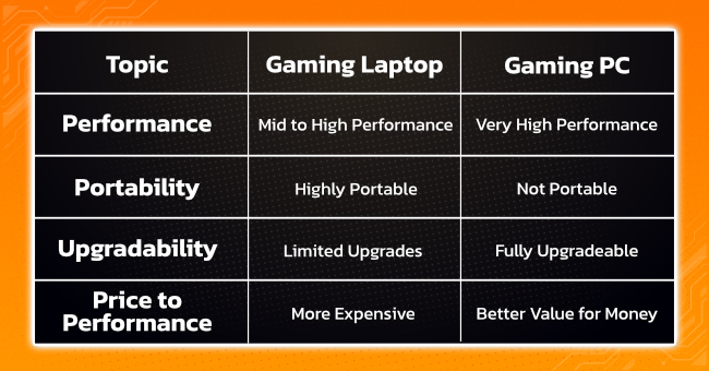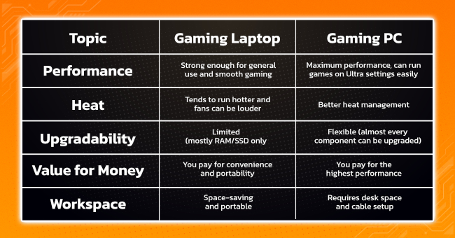 Gaming PC: At the same price, a gaming PC usually delivers about 20–30% more performance because its components don’t need to be miniaturized like those in laptops.