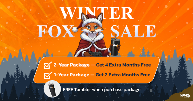 Wrap up the year with our special WINTER FOX SALE! Get extra days of usage when you purchase an annual package, plus a cool VPN4Games exclusive tumbler. Enjoy smooth gaming with no lag, fast routing for every game, and get ready to kick off the new year like a true pro gamer!