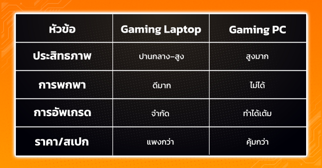 Gaming PC: ในราคาที่เท่ากัน PC มักจะได้สเปกที่ แรงกว่าประมาณ 20-30% เพราะชิ้นส่วนไม่ต้องถูกออกแบบให้เล็กลงเหมือน Laptop