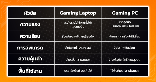 Gaming Laptop: ด้วยพื้นที่จำกัด พัดลมมักจะมีขนาดเล็กและเสียงดังกว่าเมื่อใช้งานหนัก และมักจะมีความร้อนสะสมสูงกว่า ซึ่งอาจส่งผลต่ออายุการใช้งานถ้าเล่นในห้องไม่ปรับอากาศ