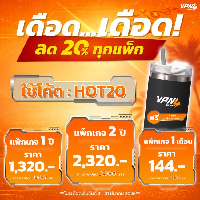 ซัมเมอร์นี้อากาศว่าร้อนแล้ว แต่โปรโมชันเราร้อนแรงกว่า ลดจริง คุ้มจริง ลดทันทีทุกแพ็กเกจ 20% พิเศษสำหรับ 20 ท่านแรกที่ซื้อแพ็กเกจใดก็ได้ รับแก้วสุดเท่จาก VPN4Games ไปเลย ดีลแรงแบบนี้ไม่ได้มีบ่อย ช้าอดนะบอกเลย